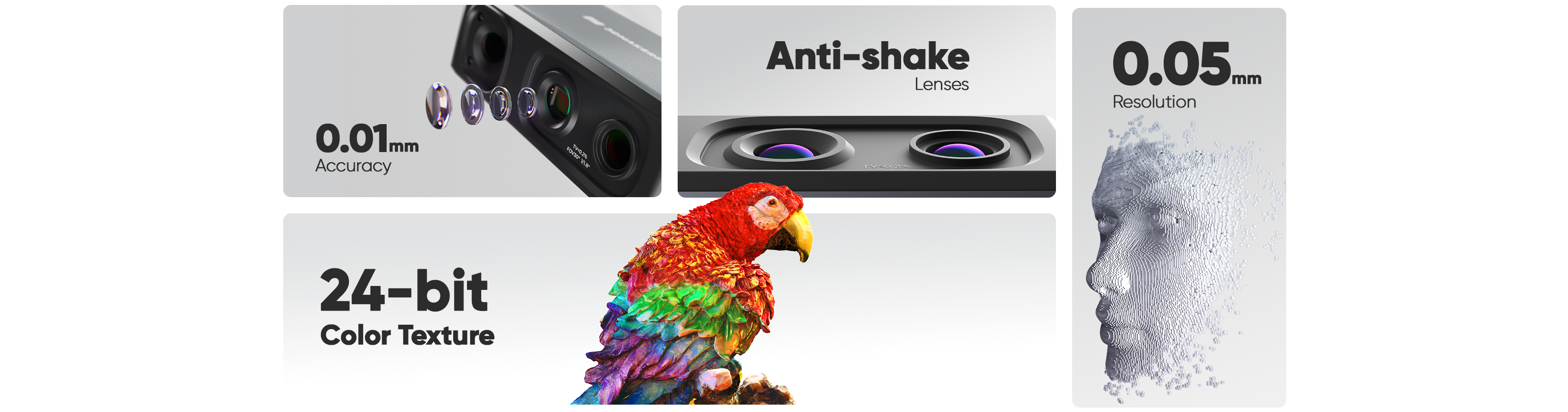 With its shorter wavelength (400 to 500 nano), it projects refined structured light, achieving 0.01mm accuracy. This advanced technology captures even the tiniest dents, textures, and edges, providing unparalleled detail in high-resolution 3D models.
